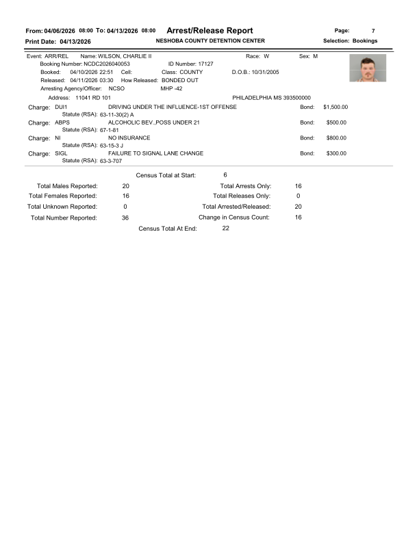 PHILADELPHIA, Miss. (Queen City Newsfeed) — The Neshoba County Detention Center released its weekly arrest and release report for the period of April 06 through April 13, 2026. The report lists individuals booked into and released from the detention facility in Philadelphia, Mississippi during that week.