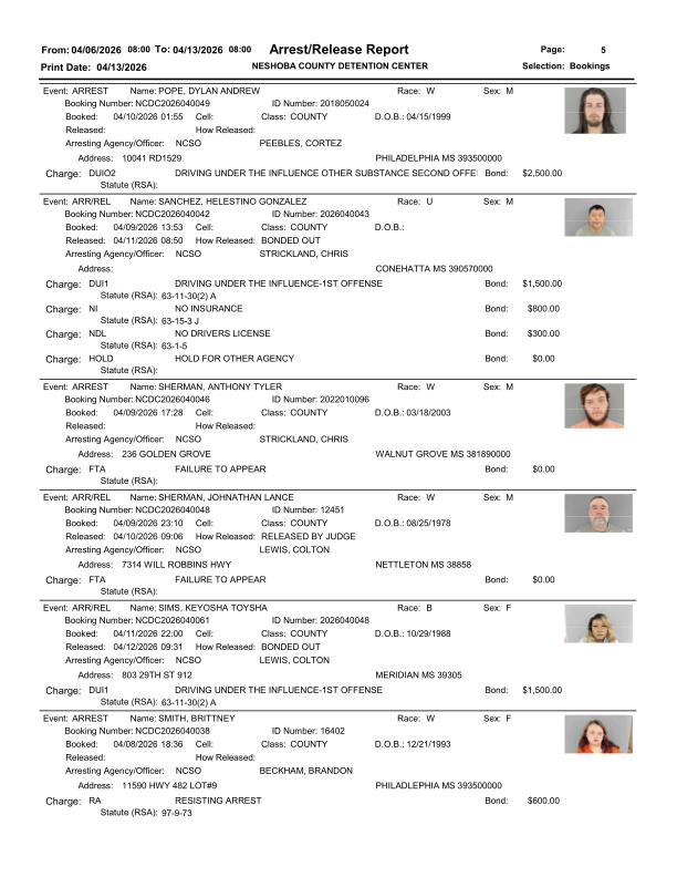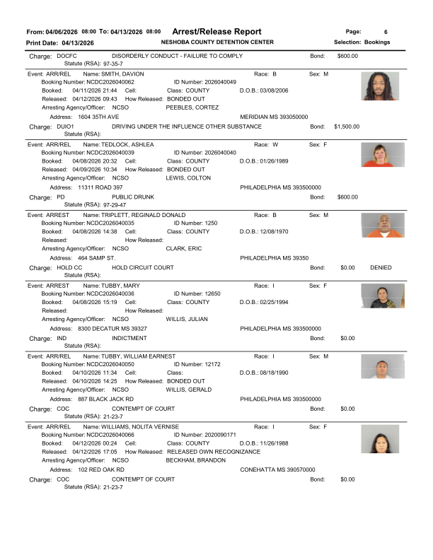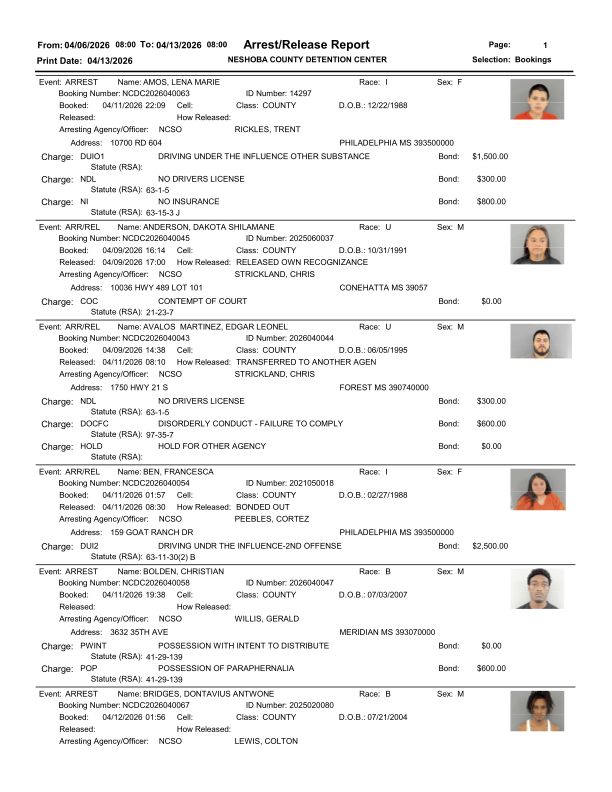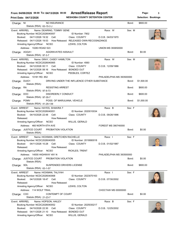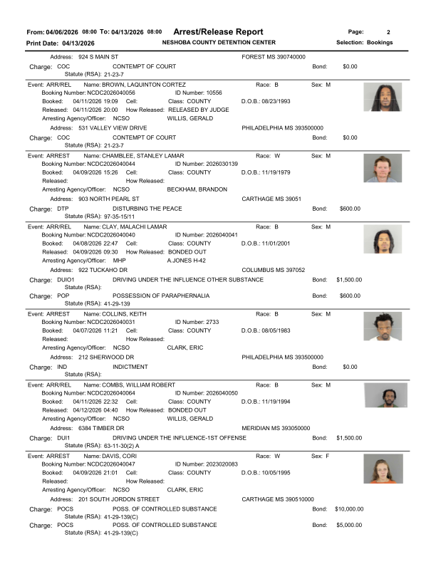 Officials say the report reflects recent law enforcement activity across Neshoba County. The detention center publishes this information as part of its routine public records process. Each entry shows the charges filed at the time of booking and the corresponding arrest or release dates.
