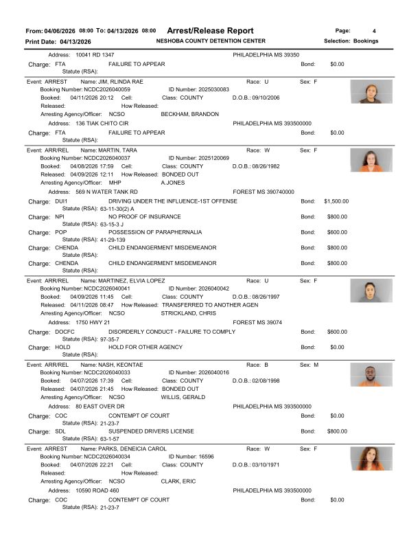 The Neshoba County Sheriff’s Department provides this information in the interest of public safety and transparency. All individuals named in this report are presumed innocent until proven guilty in a court of law.